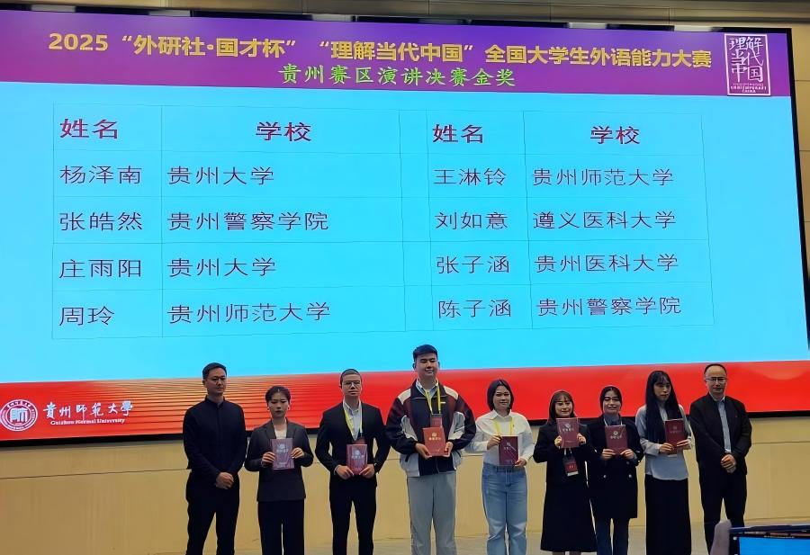 2025年10月31日,由贵州省教育厅主办、贵州师范大学承办,贵州省大学外语教学研究会与外语教学与研究出版社协办的2025“外研社・国才杯”“理解当代中国”全国大学生外语能力大赛贵州省赛区选拔赛圆满落幕。贵州大学学子在赛事中表现亮眼,参加所有赛项均获金奖,取得了16金8银3铜的优异成绩。本次省赛获得金奖的同学将代表贵州省参加12月份在北京举行的全国总决赛。
