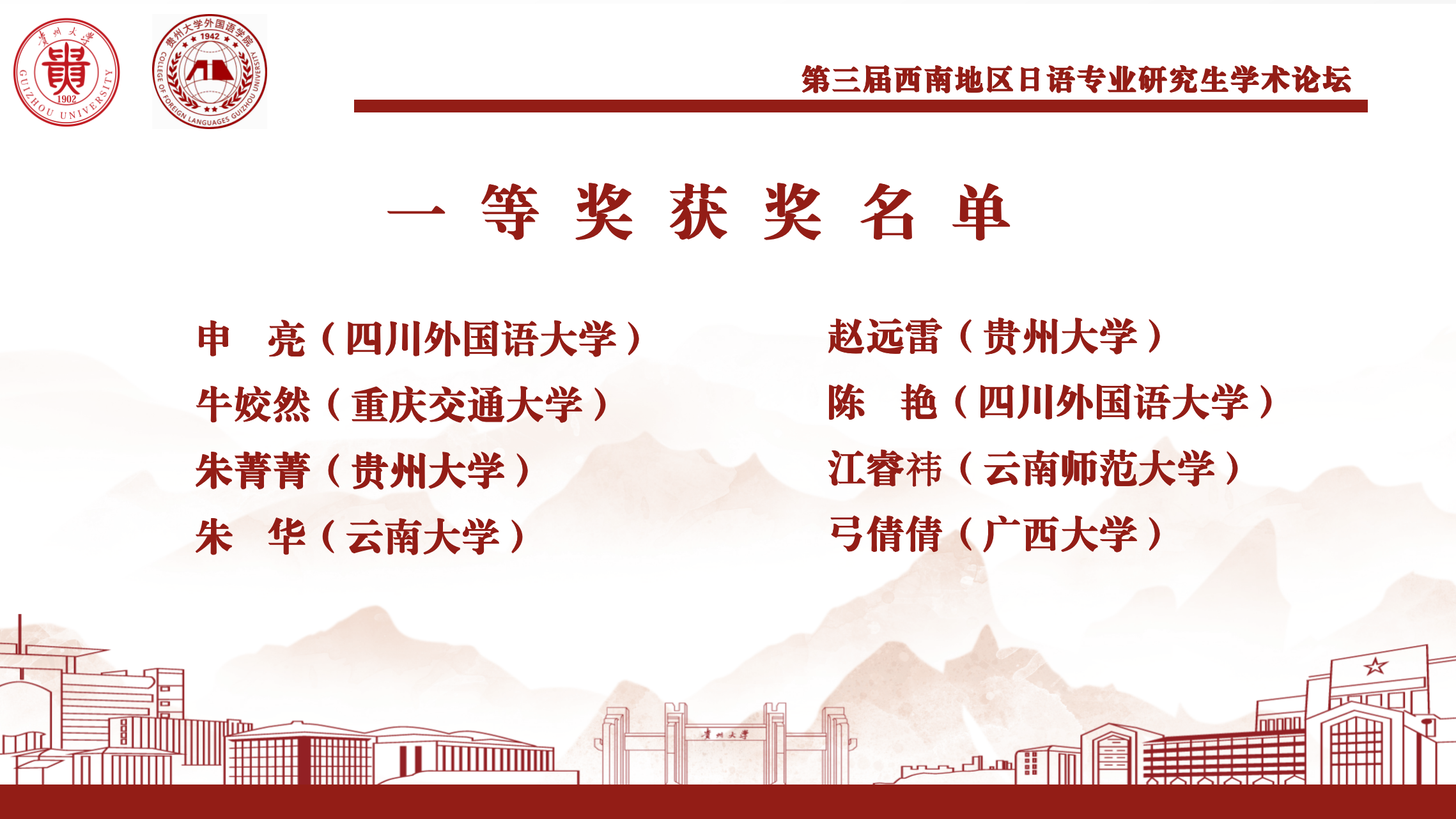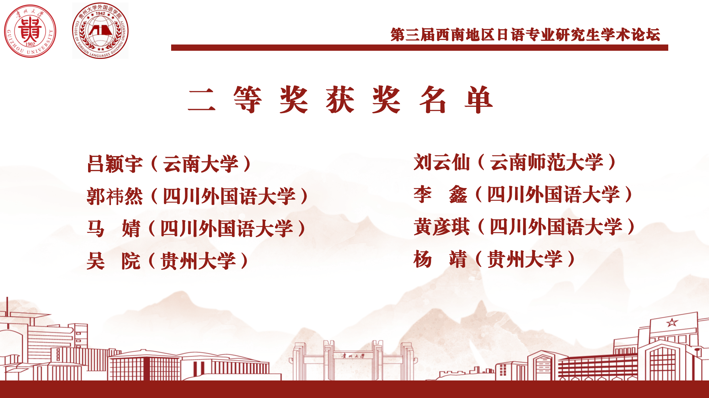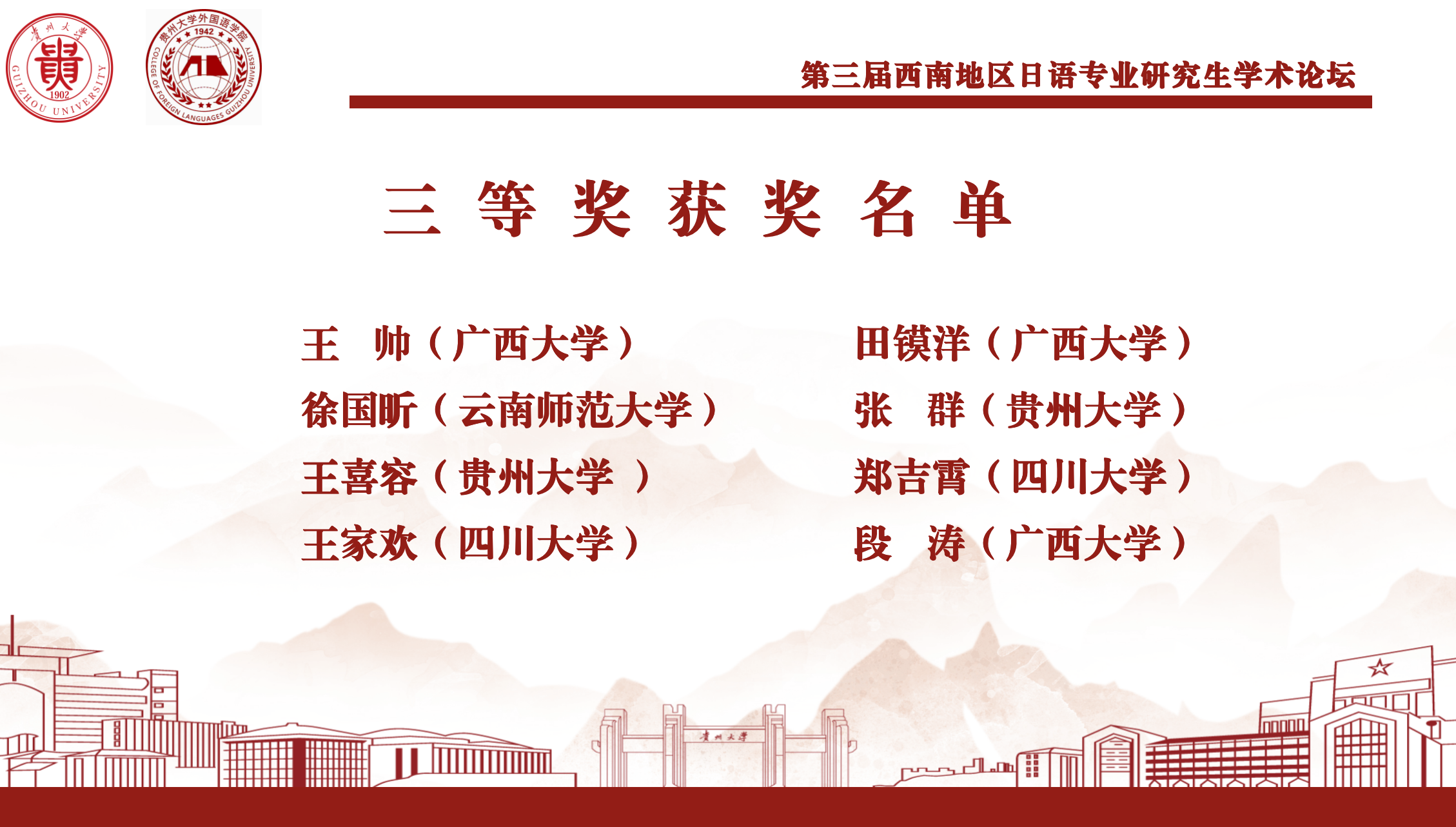 2025年11月15日至16日,“第三届西南地区日语专业研究生学术论坛”于贵州大学东校区顺利召开。本次论坛由西南地区日语研究生教育联盟主办,贵州大学外国语学院承办。论坛共收到来自云、贵、川、渝、桂等省、自治区、直辖市14所高校日语专业硕士生、博士生的92篇学术论文,贵州大学、四川外国语大学、四川大学、云南大学、重庆大学、重庆交通大学、广西大学等高校的师生参加了会议。