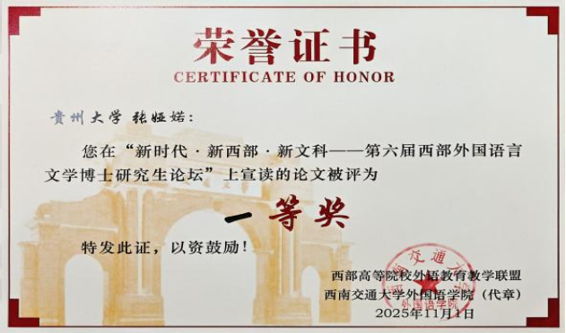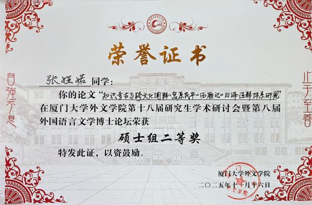 2025年11月16日,由厦门大学外文学院主办了“厦门大学外文学院第十八届研究生学术研讨会暨第八届外国语言文学博士论坛”,入围该论坛的有包括北京外国语大学、南开大学、南京大学、香港大学、哈尔滨工业大学等多个知名院校的近100名本科、硕士、博士研究生,会议规模庞大,学术成果丰硕。在此次论坛上,我院学子张娅婼获得“二等奖”。