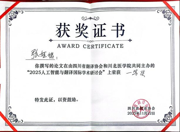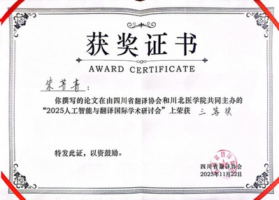 2025年11月22日,由四川省翻译协会主办了“2025人工智能与翻译国际学术研讨会”,该会议有包括四川外国语大学、四川大学、重庆大学等高校的100余名硕士、博士研究生参加,我院有8名研究生入围,其中张娅婼获得“一等奖”、朱菁菁获得“三等奖”。