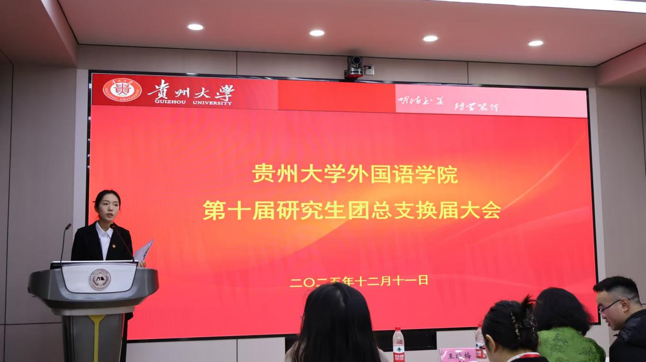 根据《中国共产主义青年团章程》和共青团有关文件要求,2025年12月11日,贵州大学外国语学院第十届研究生团总支换届大会在东校区外语楼201会议室举行。外国语学院党委副书记杨莉萍、副院长王晓梅、研究生科吴江进出席会议,学院研究生团员代表50余人参会。