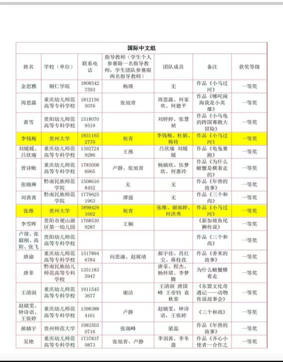 日前,2026年中国—东盟学前教育语言教学设计大赛结果正式发布,由贵州大学外国语学院国际中文教育研究生组成的多支参赛队伍,凭借扎实的专业素养与创新的教学设计,从全国260余所高校、幼师及海外大学派出的参赛队伍中脱颖而出,斩获一等奖两项(小组成员分别为:李钱梅、杜娟、韩传;张维、谢雨婷、何洪秀),二等奖1项(小组成员为:姚钦、罗达琴、杨可)的优异成绩。