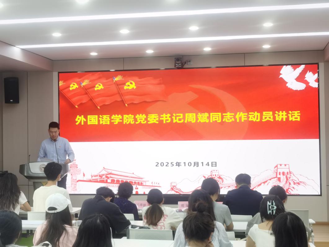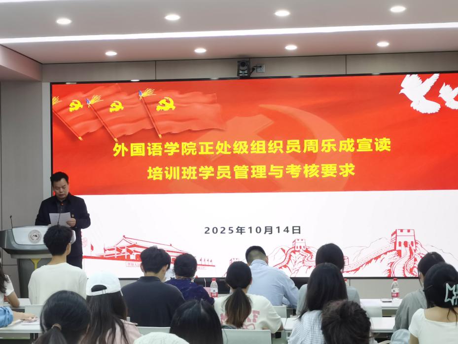 2025年10月14日,中共贵州大学外国语学院委员会分党校第二十二期党员发展对象培训班开班典礼在外国语学院201会议室举行。校关工委副主任匡萍波、外国语学院党委书记周斌、正处级组织员周乐成、各党支部书记及全体培训班学员参加典礼。