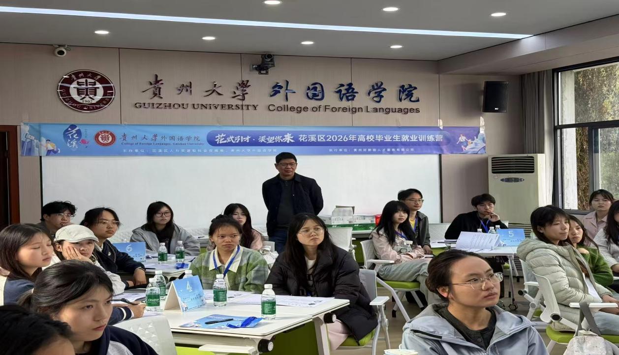 为贯彻落实《贵阳贵安“筑人才·强省会”行动实施方案(2024—2026年)》《花溪区2025年高校职业指导(就业服务)站工作方案》等文件要求,充分发挥“花式引才·溪望你来”青年人才服务品牌在促进就业、扶持创业、助力人才赋智方面的示范引领作用,贵阳市花溪区人社局、贵州大学外国语学院、贵州好黔程人才服务有限公司于3月30日、31日在贵州大学东校区外国语学院201会议室联合举办贵阳市花溪区2026年高校毕业生就业训练营活动。