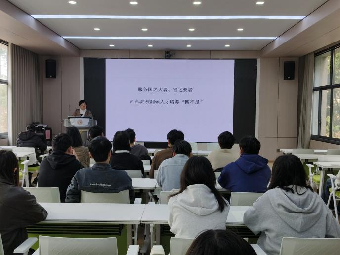 麻金星、杜肖瑞、汪洋、王晓敏分别向同学们详细介绍了学院外国语言学及应用语言学、英语语言文学、日语语言文学、翻译四个硕士点的师资力量、培养特色、研究方向及就业发展前景,热忱欢迎同学们踊跃报考。