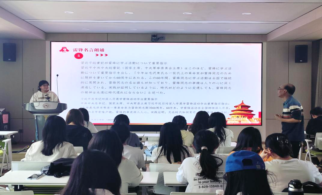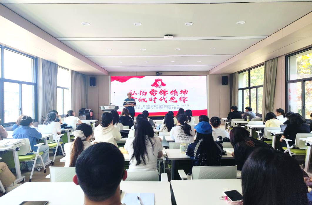 为深入学习贯彻习近平总书记关于弘扬雷锋精神的重要指示精神,传承红色基因、厚植家国情怀,引导广大青年学子将雷锋精神内化于心、外化于行,2026年4月9日,贵州大学明德一社区外国语学院功能型第一党支部、第二党支部在学院201室联合开展“雷锋行・志愿红”主题活动。本次活动由功能型第二党支部书记张涛老师主讲,两个支部的学生党员代表用英语、日语、缅甸语进行多语种雷锋名言朗诵,功能型第一党支部书记桂克林老师作总结发言。共计70余名学生党员参加活动。
