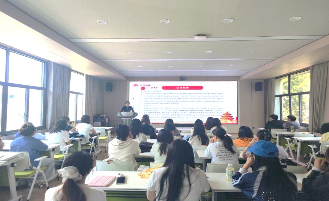 张涛老师以“弘扬雷锋精神 争做时代先锋”为题作宣讲。他围绕认识雷锋、雷锋精神、时代价值三个层面,系统讲述了雷锋同志的生平事迹——在党和政府的关怀下成长,1960年参军入党,荣立二等功一次、三等功两次,1962年因公殉职,用短暂一生践行了为人民服务的誓言。张涛老师指出,雷锋精神是全心全意为人民服务的奉献精神,是艰苦创业、自强不息的奋斗精神,是顾全大局、克己奉公的主人翁态度,也是助人为乐、诚实守信的良好风尚。他带领大家重温了1963年毛泽东同志“向雷锋同志学习”的题词,系统学习习近平总书记多次强调的“雷锋精神是永恒的”等重要指示精神。他勉励同学们将雷锋精神与专业学习、社会实践相结合,用外语讲好中国故事。