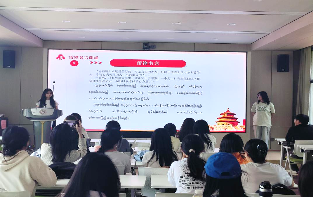 活动设置了多语种雷锋名言朗诵环节。英语专业原佳郁同学用流利英语朗诵《雷锋日记》选段,诠释“一滴水滋润一寸土地”的奉献情怀;日语专业吴伊同学用日语演绎雷锋名言及习近平总书记关于学雷锋活动的重要指示;缅甸语专业任桂兰、尹伊蕊同学合作朗诵缅甸语版《雷锋日记》节选。多语种朗诵将语言学习与红色教育深度融合,赢得现场阵阵掌声。